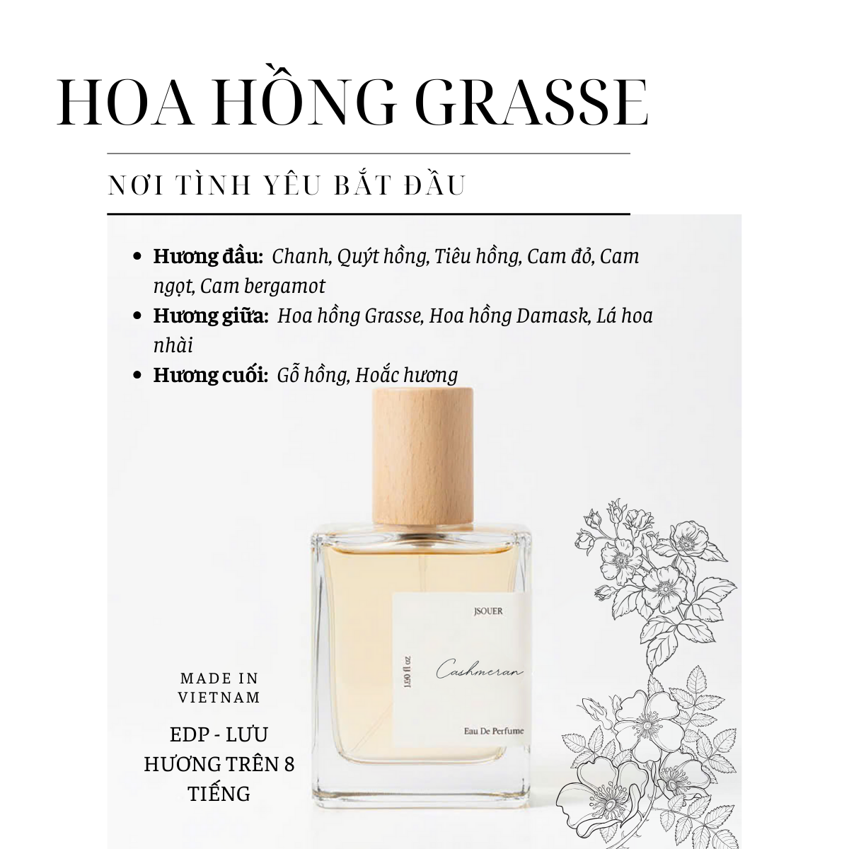 Nếu ví nước hoa là một bức tranh, thì Hoa Hồng Grasse chính là kiệt tác của sự hài hòa giữa thanh lịch và gợi cảm, mở ra hành trình đầy cảm xúc qua từng tầng hương. Nếu bạn là một tín đồ của hoa hồng Pháp, thì “Hoa Hồng Grasse” chính là món quà dành riêng cho bạn – một mùi hương mang theo cái hồn của những cánh đồng hoa bất tận tại Grasse